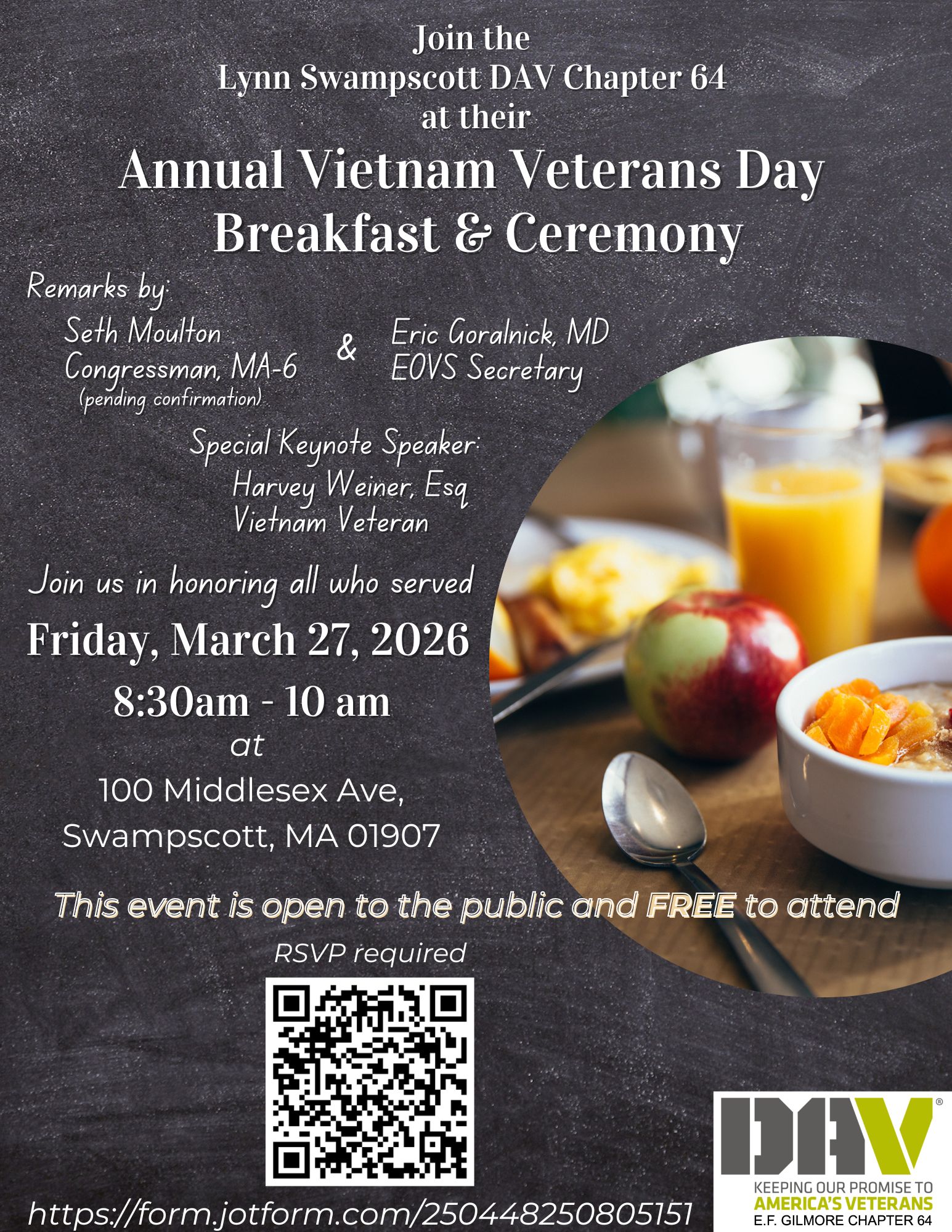 From the Lynn Swampscott DAV (Disabled American Veterans) Chapter 64: The annual Vietnam Veterans Day Breakfast and Ceremony will be helad on Friday, March 27, 2026, from 8:30 a.m. to 10:00 a.m. at 100 Middlesex Avenue in Swampscott, Massachusetts. The event will honor the service and sacrifice of Vietnam veterans and recognize their enduring contributions to our nation and local communities.