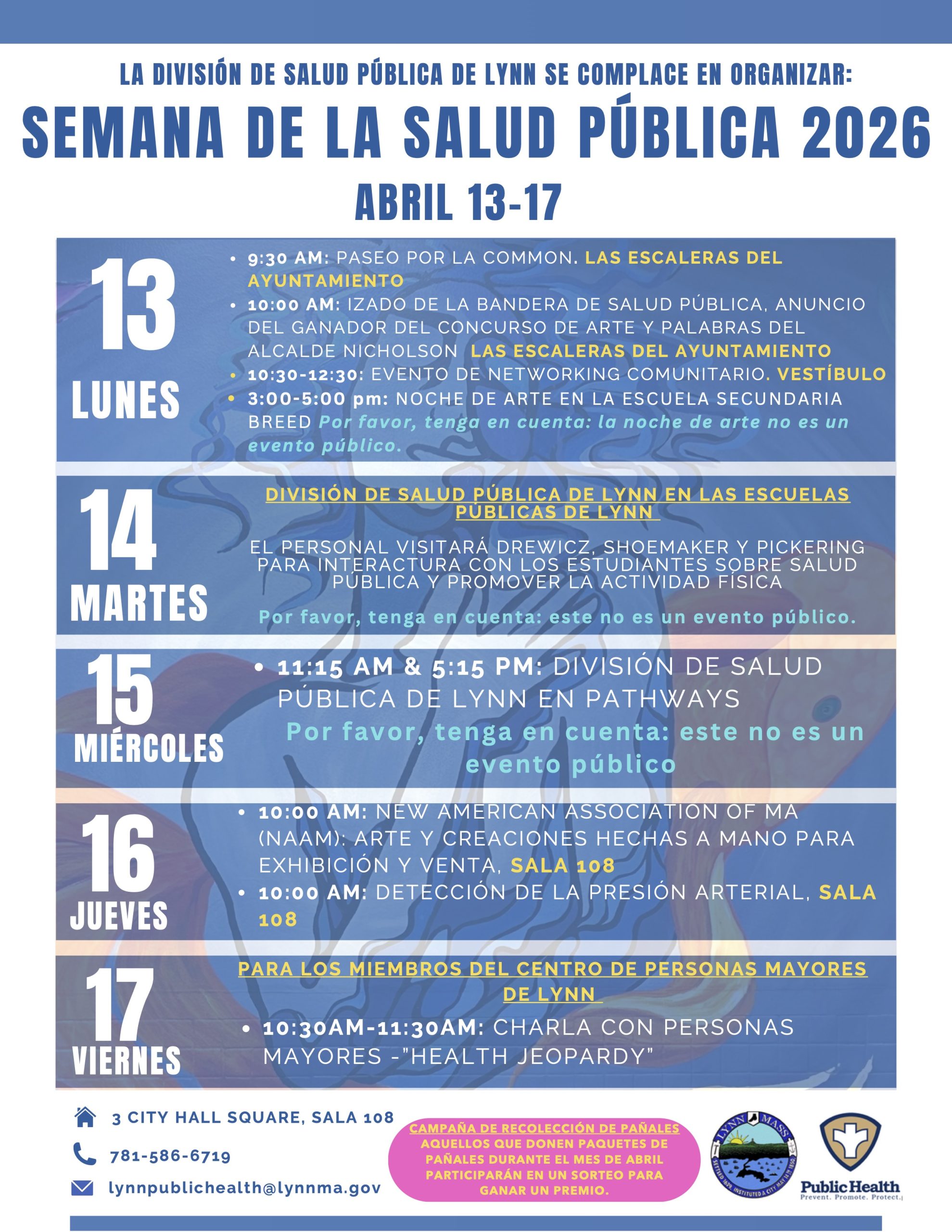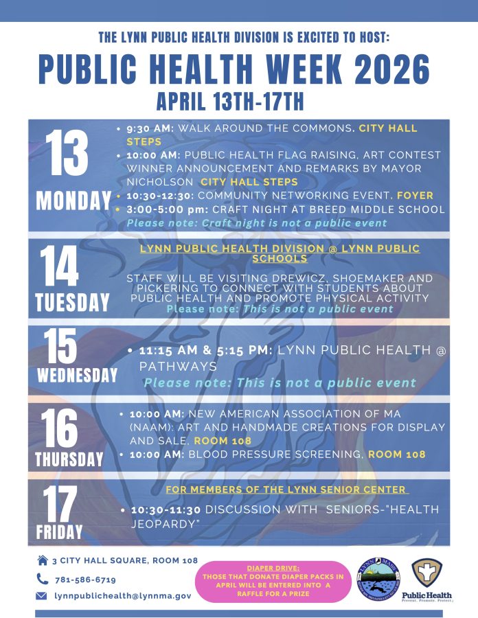 From the Lynn Public Health Department: Lynn Public Health Week 2026 is April 13 – 17! Please see the flyers below (English/Spanish) with the schedule. We encourage you to share with your networks.