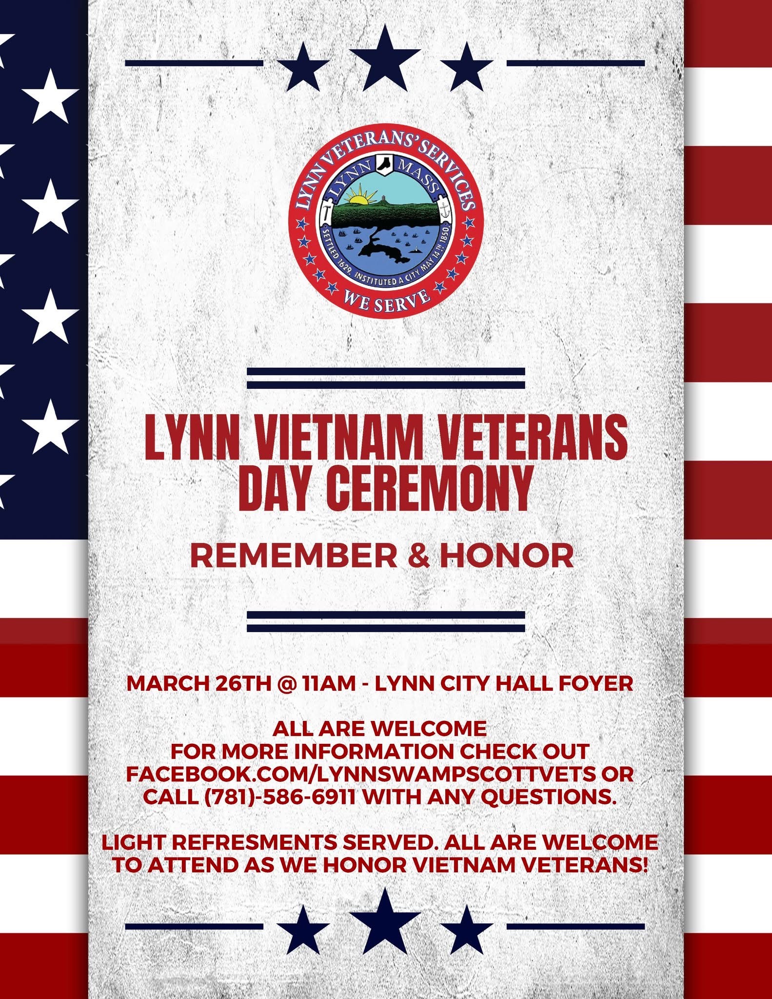 From Lynn-Swampscott Veterans’ Services Department: The City of Lynn will hold its Vietnam Veterans Day Ceremony on Thursday, March 26th at 11:00 AM in the Lynn City Hall foyer. All are welcome!