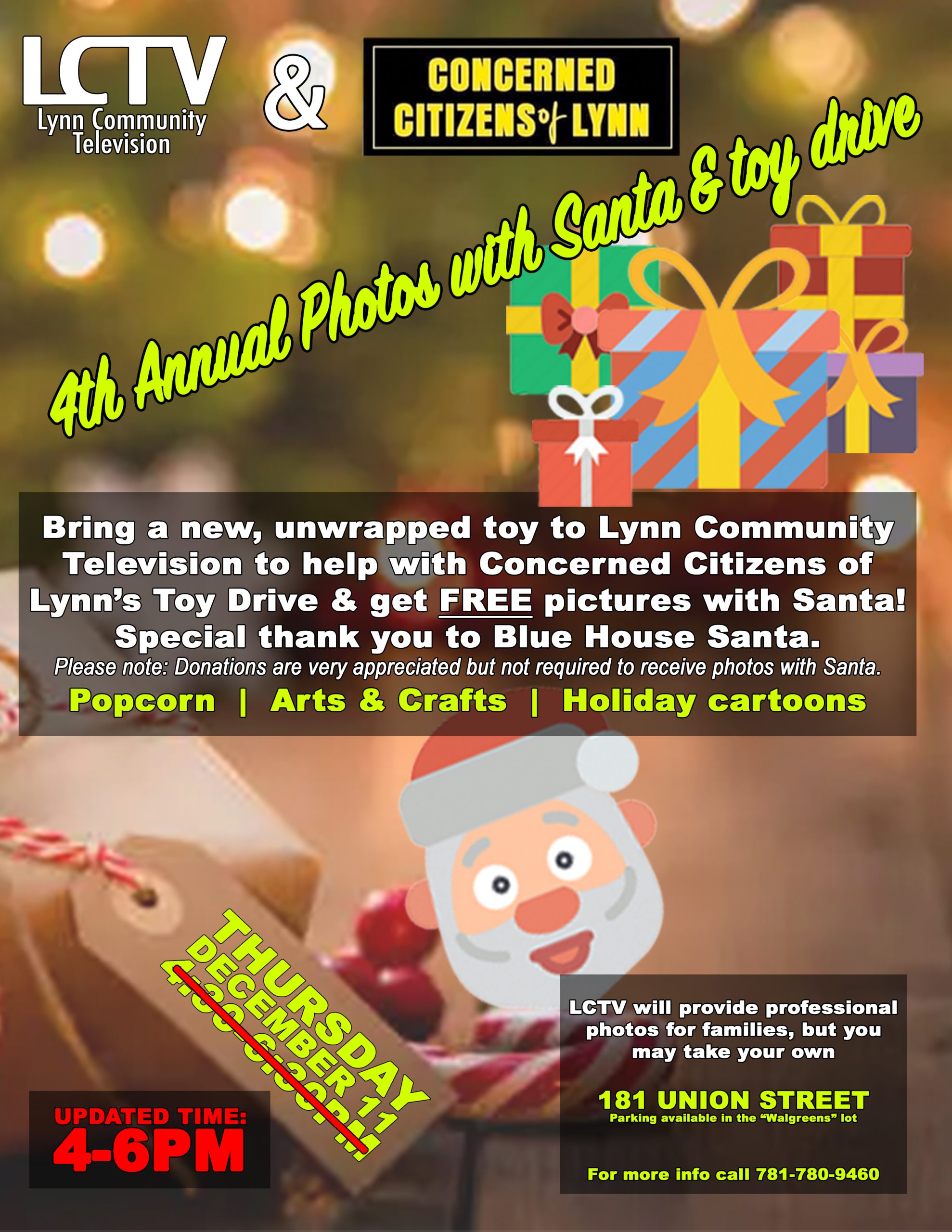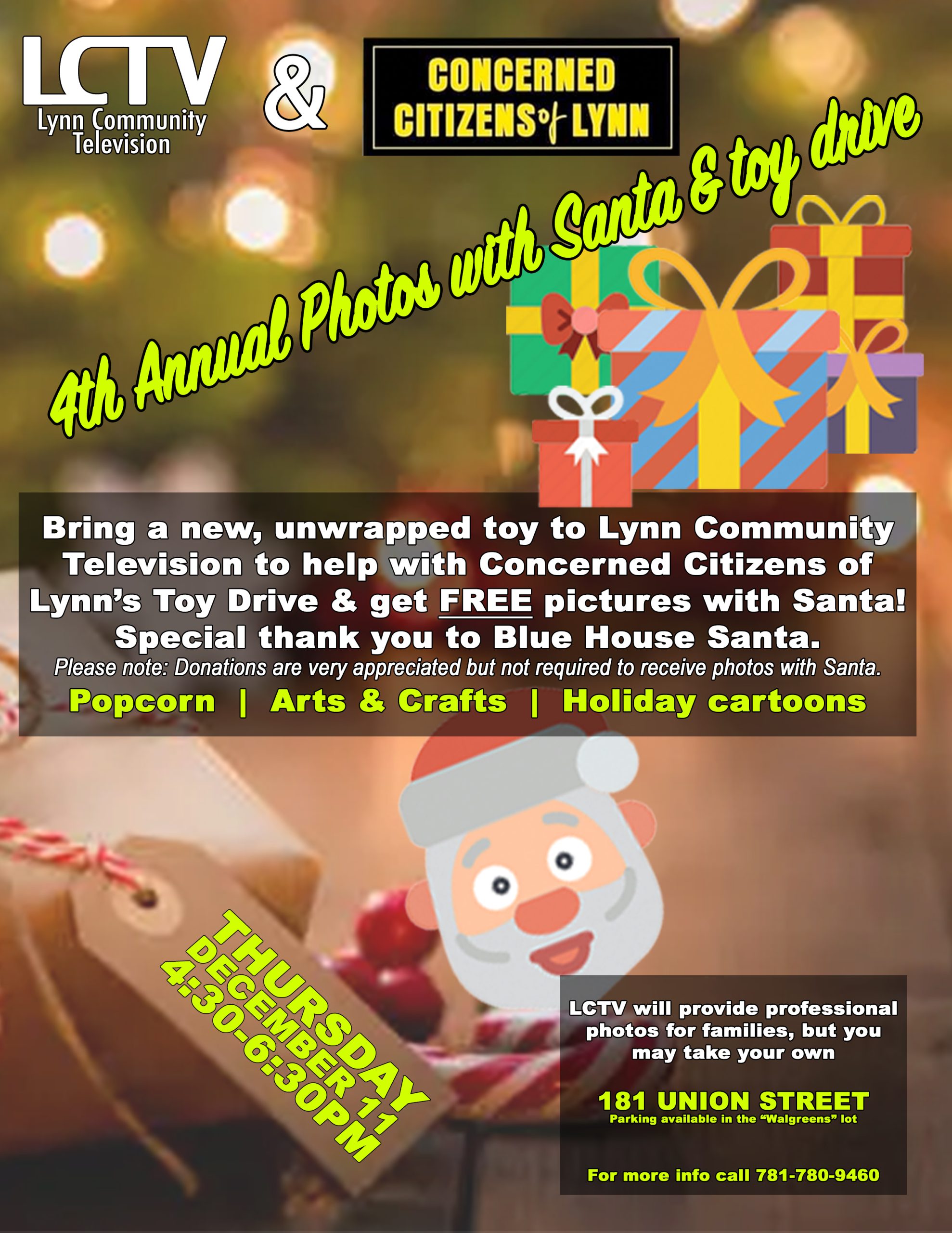 🎅 Bring a new, unwrapped toy to Lynn Community Television to help with Concerned Citizens of Lynn’s Toy Drive & get FREE pictures with Santa! Special thank you to Blue House Santa.