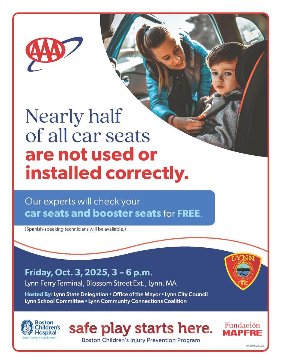 From Lynn Community Connections Coalition: This is car seat safety event that is being hosted by the Lynn State Delegation, Office of the Mayor, Lynn City Council, Lynn School Committed and the Lynn Community Connections Coalition on Friday, 10/3/25 from 3-6pm at the Lynn Ferry Terminal, Blossom Street Ext.