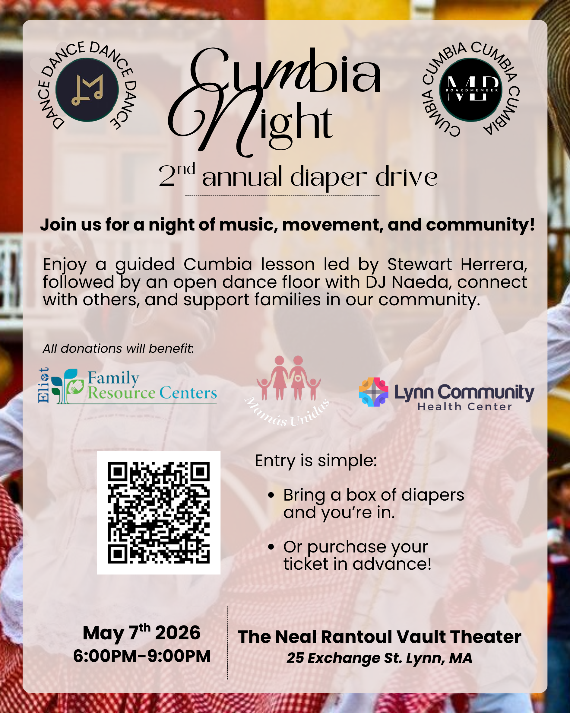 From Millennium Latino Project: Join us for Cumbia Night, our 2nd Annual Diaper Drive supporting local families in Lynn and across the North Shore. Come enjoy a fun cumbia dance lesson led by Stewart Herrera, followed by an open dance floor led by Dj Naeda, and a night rooted in culture, and community. Whether you’re stepping onto the dance floor for the first time or already love cumbia, this is about coming together, celebrating, and giving back.