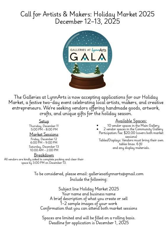 From Galleries at LynnArts (GALA): GALA’s Holiday Market, a festive two-day event celebrating local artists, makers, and creative entrepreneurs, returns on December 12 & 13! Homemade & Handmade unique gifts for all your Holiday Shopping needs.