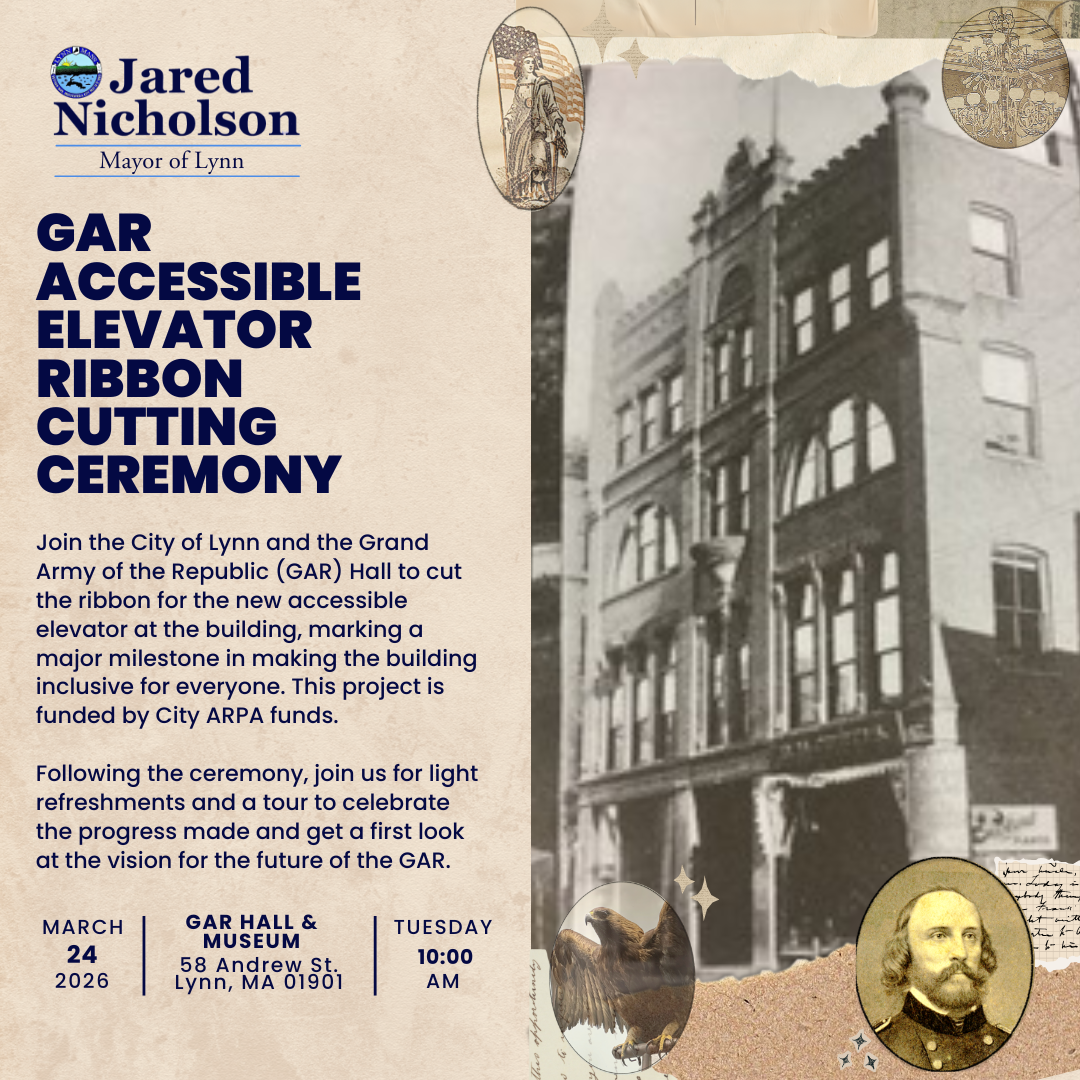 from the Grand Army of The Republic Hall & Museum: Join the City of Lynn and the Grand Army of the Republic (GAR) Hall to cut the ribbon for the new accessible elevator at the building, marking a major milestone in making the building inclusive for everyone. This project is funded by City ARPA funds.