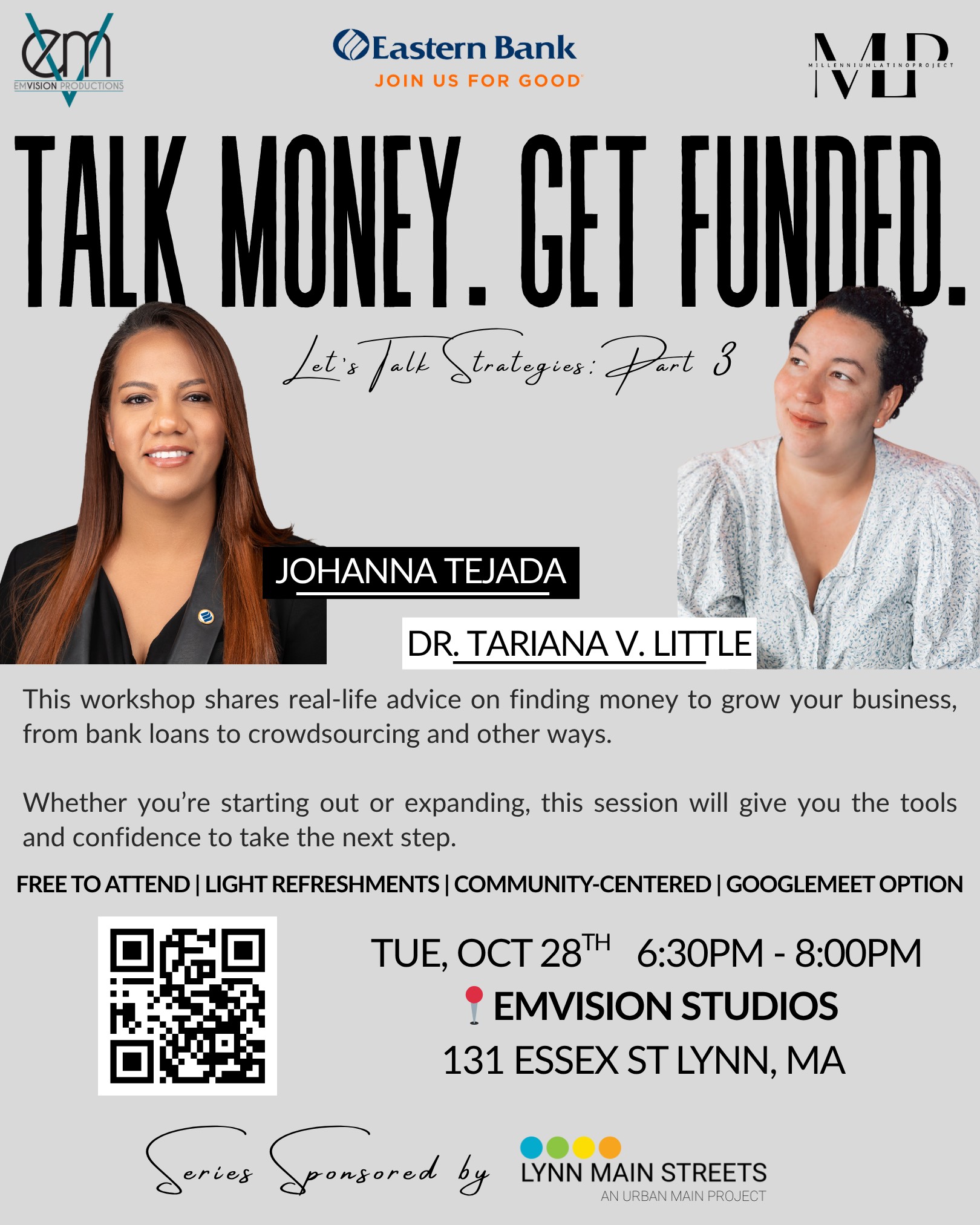 From Millennium Latino Project: Join us as we pick back up with Part 3: Talk Money. Get Funded in collaboration with Johanna Tejada, Business Banker Relationship Manager, from Eastern Bank and Dr. Tariana V. Little, owner of EmVision Studios.