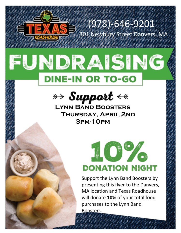 From the Lynn Band Boosters: Support the Lynn Band Boosters by presenting this flyer to the Danvers, MA location and Texas Roadhouse will donate 10% of your total food purchases to the Lynn Band Boosters.