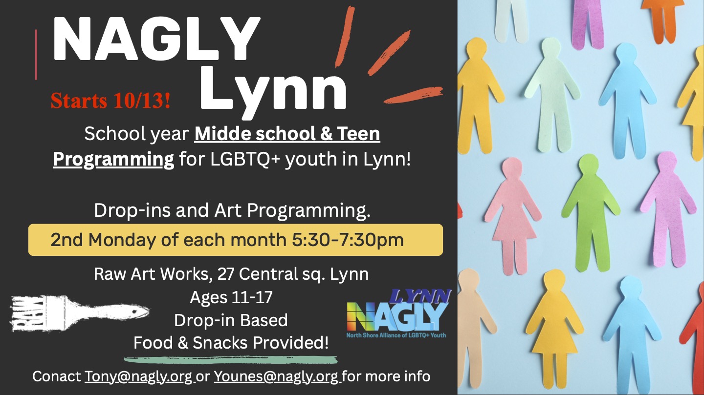 From NAGLY: NAGLY Lynn at RAW is on the 2nd Monday of each month for ages 11-17 from 5:30-7:30pm, drop-in based and open to LGBTQ+ youth!