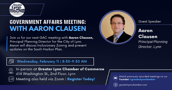 Greater Lynn Chamber of Commerce (GLCC) 614 Washington St., 2nd Floor, Lynn, MA, United States +1 moreFrom the Greater Lynn Chamber of Commerce: Join the GLCC for our next Government Affairs Committee meeting featuring Aaron Clausen, Principal Planning Director for the City of Lynn. Aaron will share insights on Inclusionary Zoning and provide updates on the City’s South Harbor Plan. This meeting will be held in person at the Greater Lynn Chamber […]