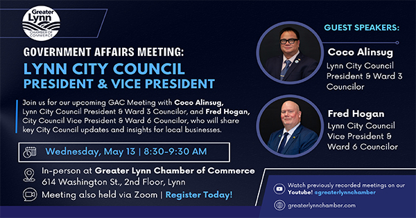 From the Greater Lynn Chamber of Commerce: Join us for our upcoming Government Affairs Committee (GAC) Meeting featuring Coco Alinsug, Lynn City Council President and Ward 3 Councilor,and Fred Hogan, Lynn City Council Vice President & Ward 6 Councilor. They’ll share important updates and insights from the City Council, along with a presentation tailored to local businesses—followed by an opportunity […]