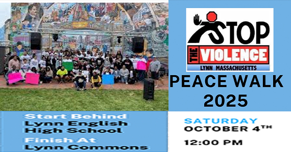 From STVL: The Stop The Violence: LYNN Committee will hold their annual Peace Walk on Saturday, October 4, 2025 at 12pm. Members of the community are invited to march from English High School to Lynn Common in a show of solidarity against the violence in Lynn.