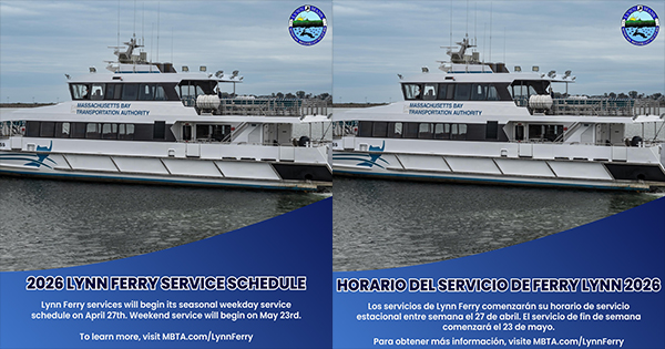 From the Office of Senator Brendan Crighton: On March 23rd the Massachusetts Bay Transportation Authority (MBTA) announced that Lynn Ferry services will begin its seasonal weekday service schedule on Monday, April 27th, 2026. Weekend service will begin on Saturday, May 23, 2026, coinciding with the Memorial Day holiday. This start date accounts for recent right whale activity, which would otherwise prevent the ferry from running at full speed and frequency.