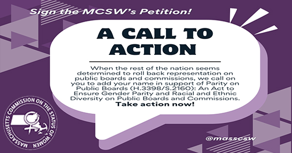 From the Massachusetts Commission on the Status of Women: We’re testing the launch of our new Take Action Hub with one of our key pieces of priority legislation known as Parity on Public Boards (H.3398/S.2160): An Act to ensure gender parity and racial and ethnic diversity on public boards and commissions.