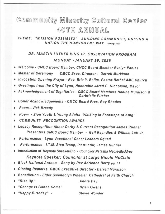 The Cultural Minority Cultural Center (CMCC) held its 40th Annual Dr. Martin Luther King Jr Day Breakfast, Legacy, & Celebration on January 19, 2026 at the Lynn Knights of Columbus. There were speeches from community and civic leaders before the keynote speaker took the stage, Founder of the North Shore Juneteenth Association and Lynn Councilor At-Larrge Nicole McClain. There were also performances by from I.T.M. Step Troop, poet Vick Breedy, and others.